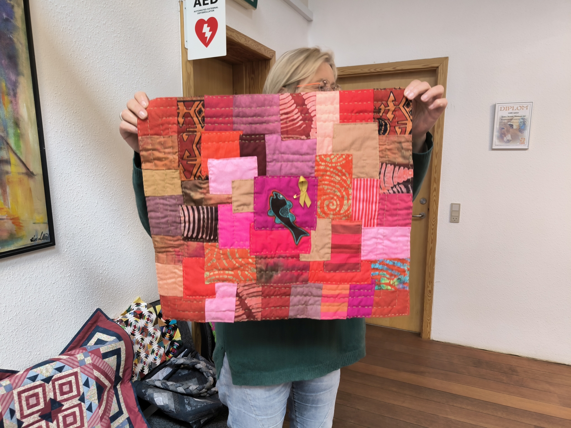 überall hingen Quilts , in allen möglichen Farbstellungen und Nähtechniken hergestellt. Auch die in